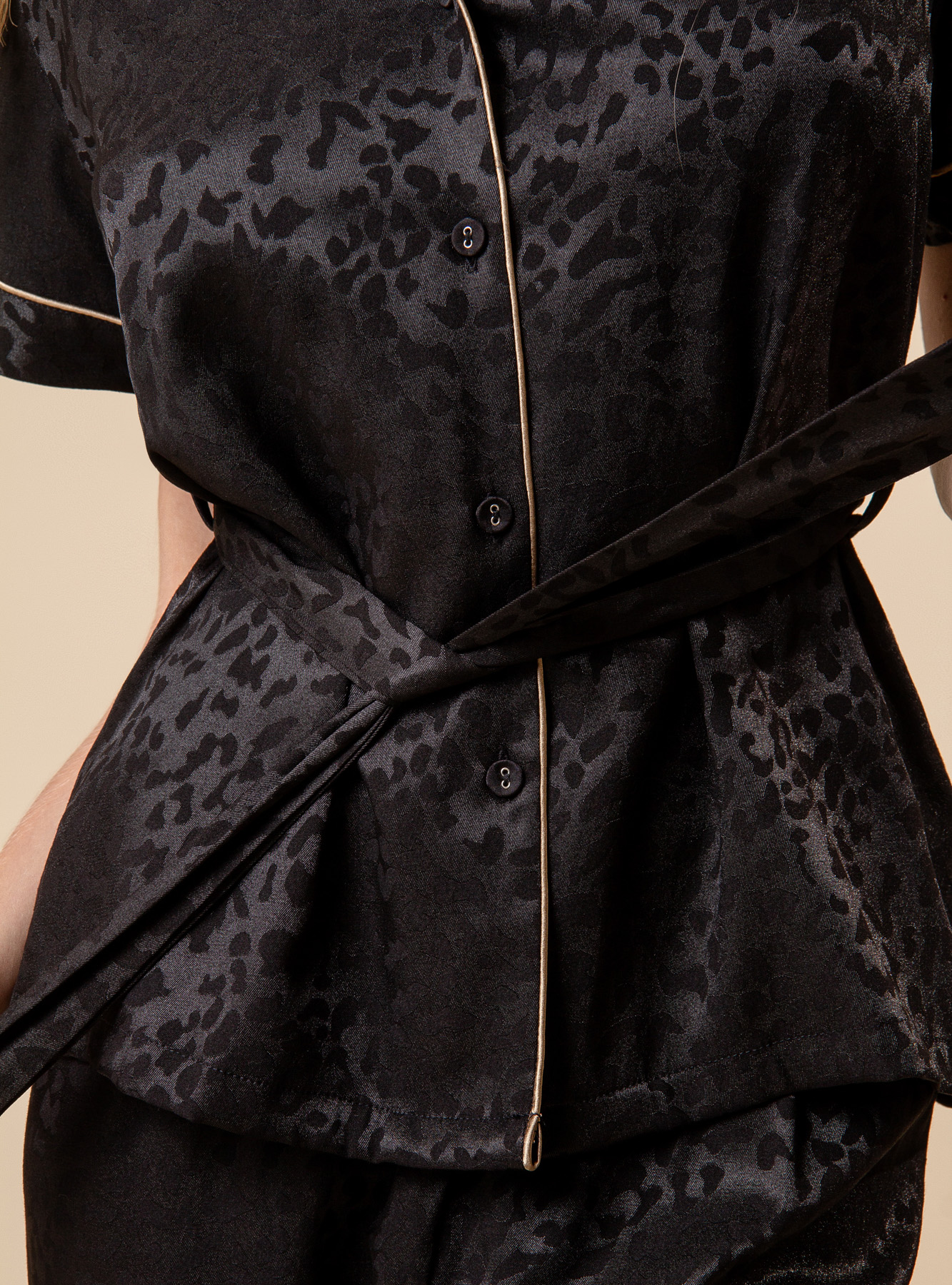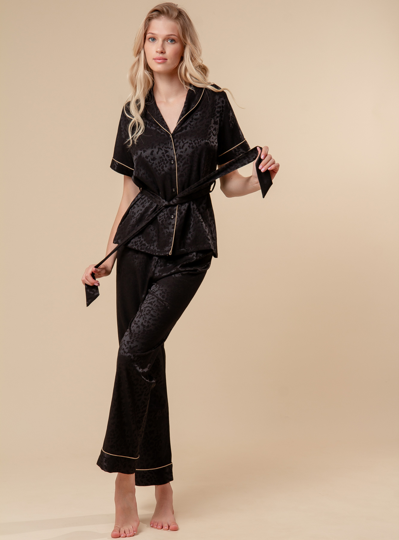Женская пижама из вискозного материала отлично поглощает влагу и пропускает воздух. Пижама включает в себя футболку с короткими рукавами, обеспечивающая свободу движений. Также футболка оснащена регулирующим поясом. В комплекте ещё идут штаны на мягкой резинке. На пижаму нанесён леопардовый принт.