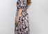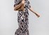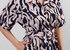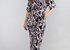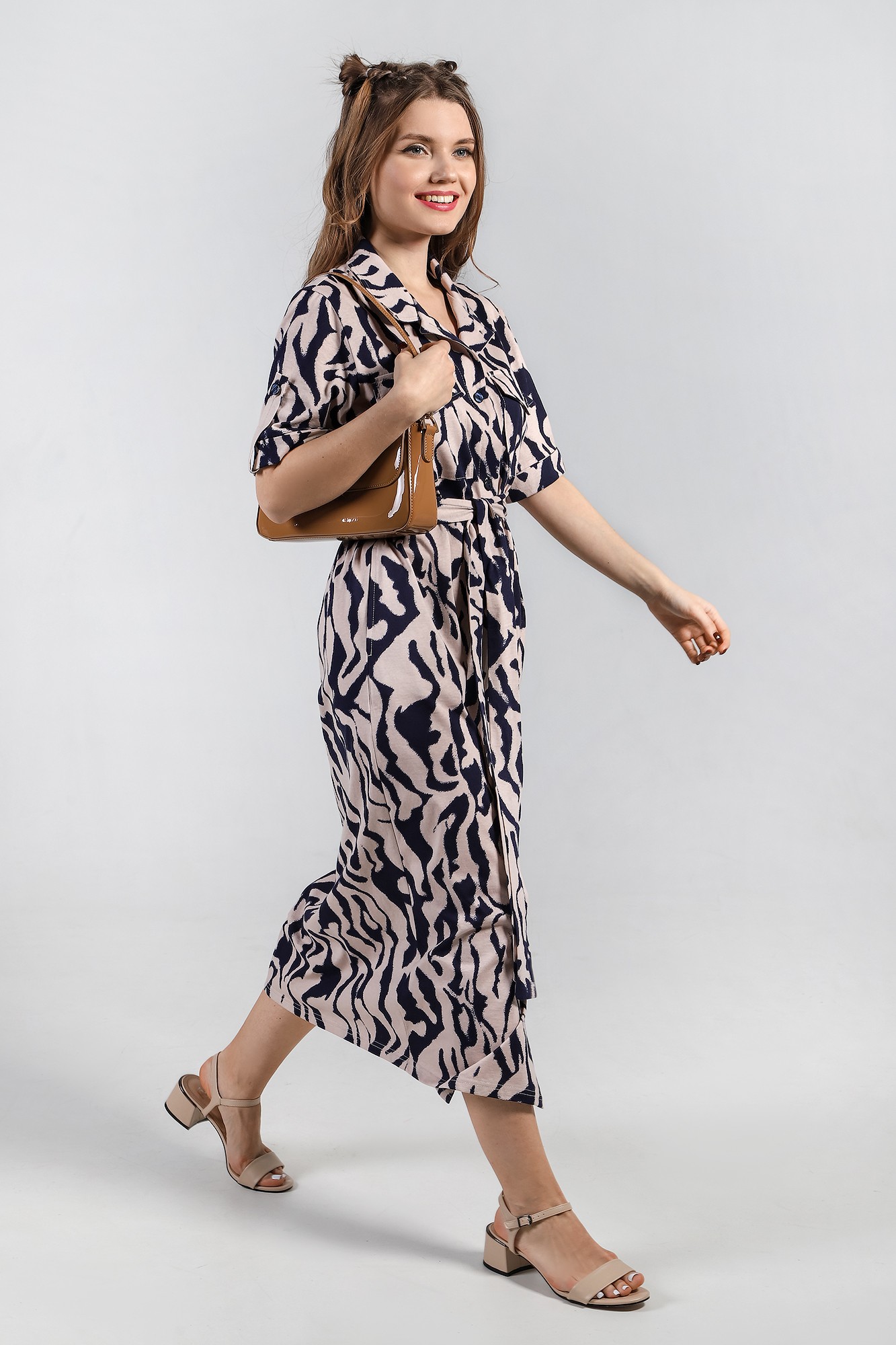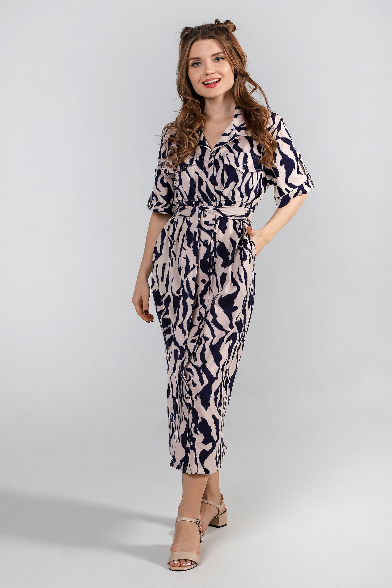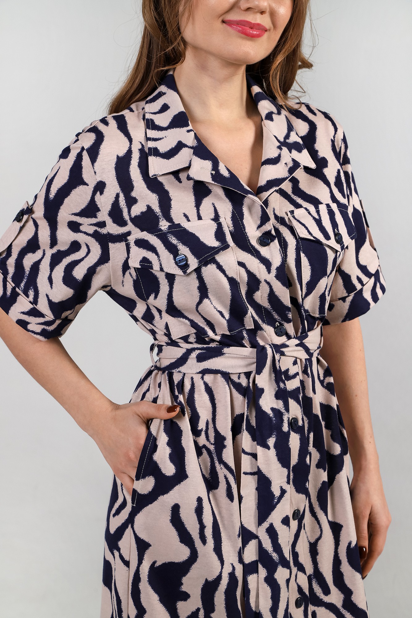 Платье из трикотажного полотна «кулирка» с набивным рисунком, удлиненная, расширенная книзу, с втачными рукавами длиной до локтя, стояче-отложным воротником и центральной бортовой застежкой на обметанные петли и пуговицы. Полочка – с двумя накладными нагрудными карманами прямоугольной формы и декоративными фигурными клапанами, застегивающими карманы на обметанную петлю и пуговицу. Рукава – с притачными манжетами-отворотами. Съемный пояс фиксируется на талии при помощи двух вытачанных из окантовки шлевок, вставленных в боковые швы.