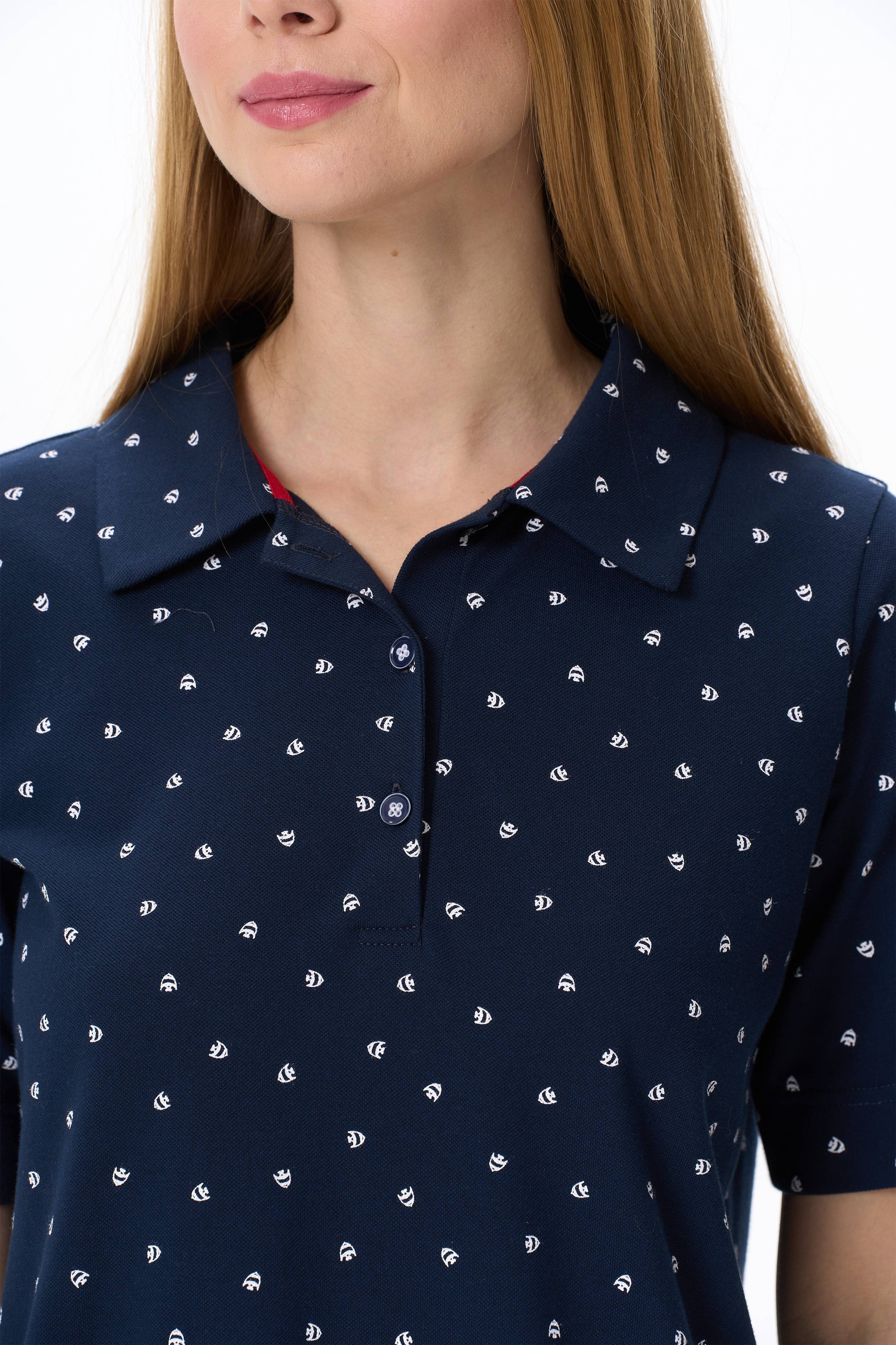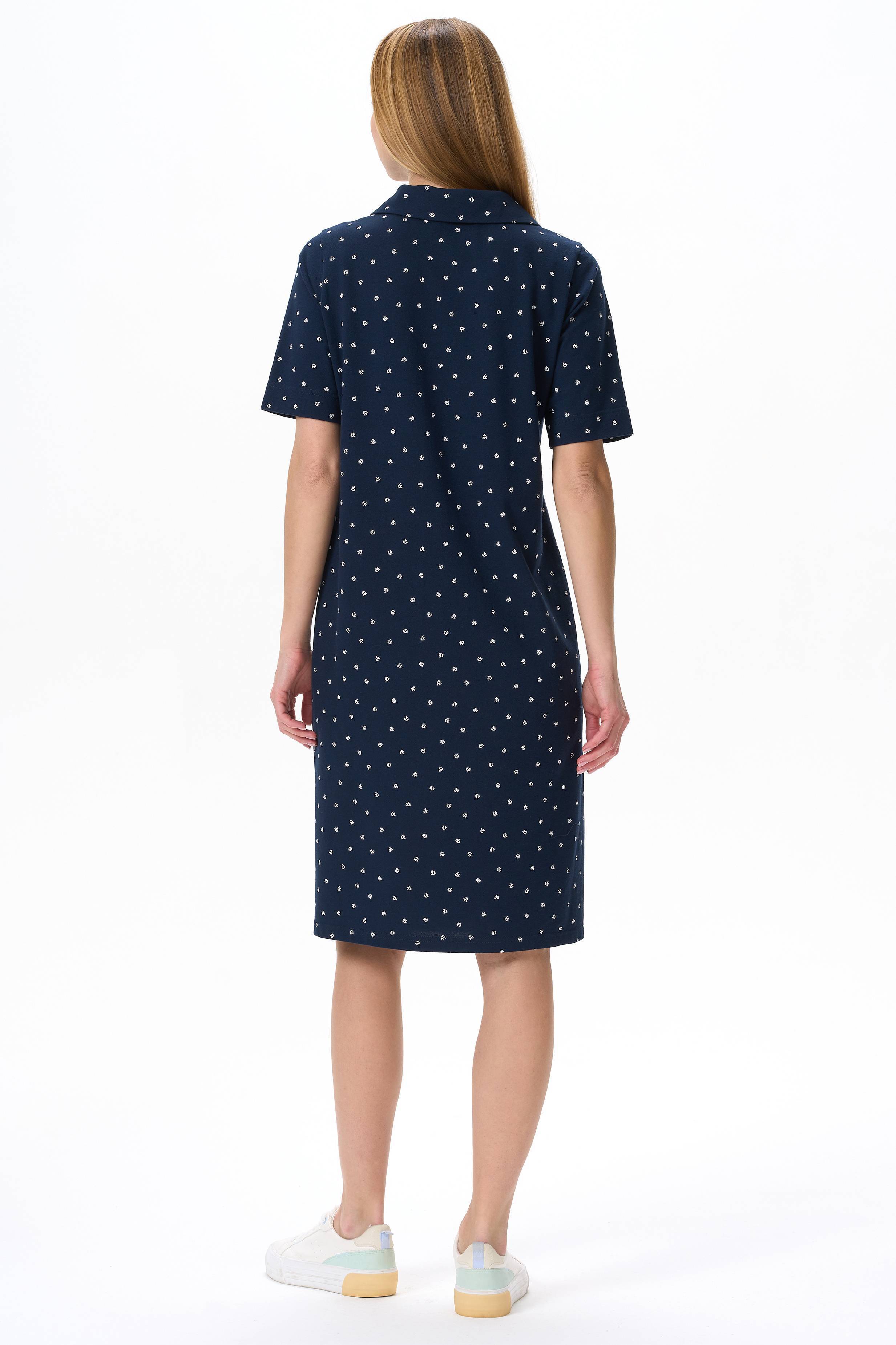 Платье - поло из хлоткового трикотажного полотна пике. Отложной воротник, застежка на пуговицы, короткий рукав, по низу изделия в боковом шве разрез. Рост модели 177см