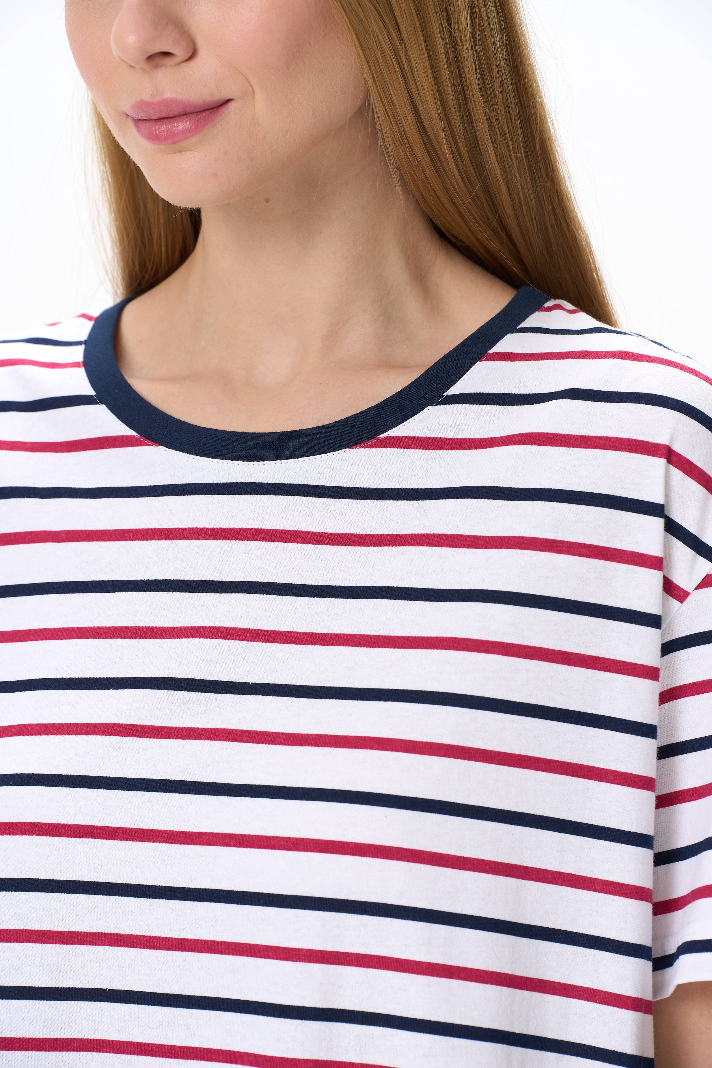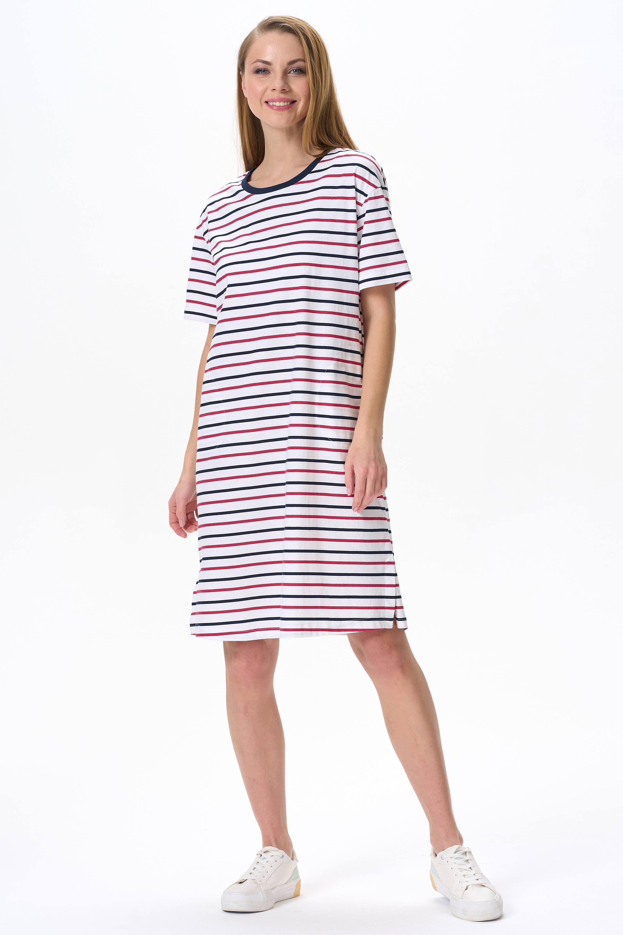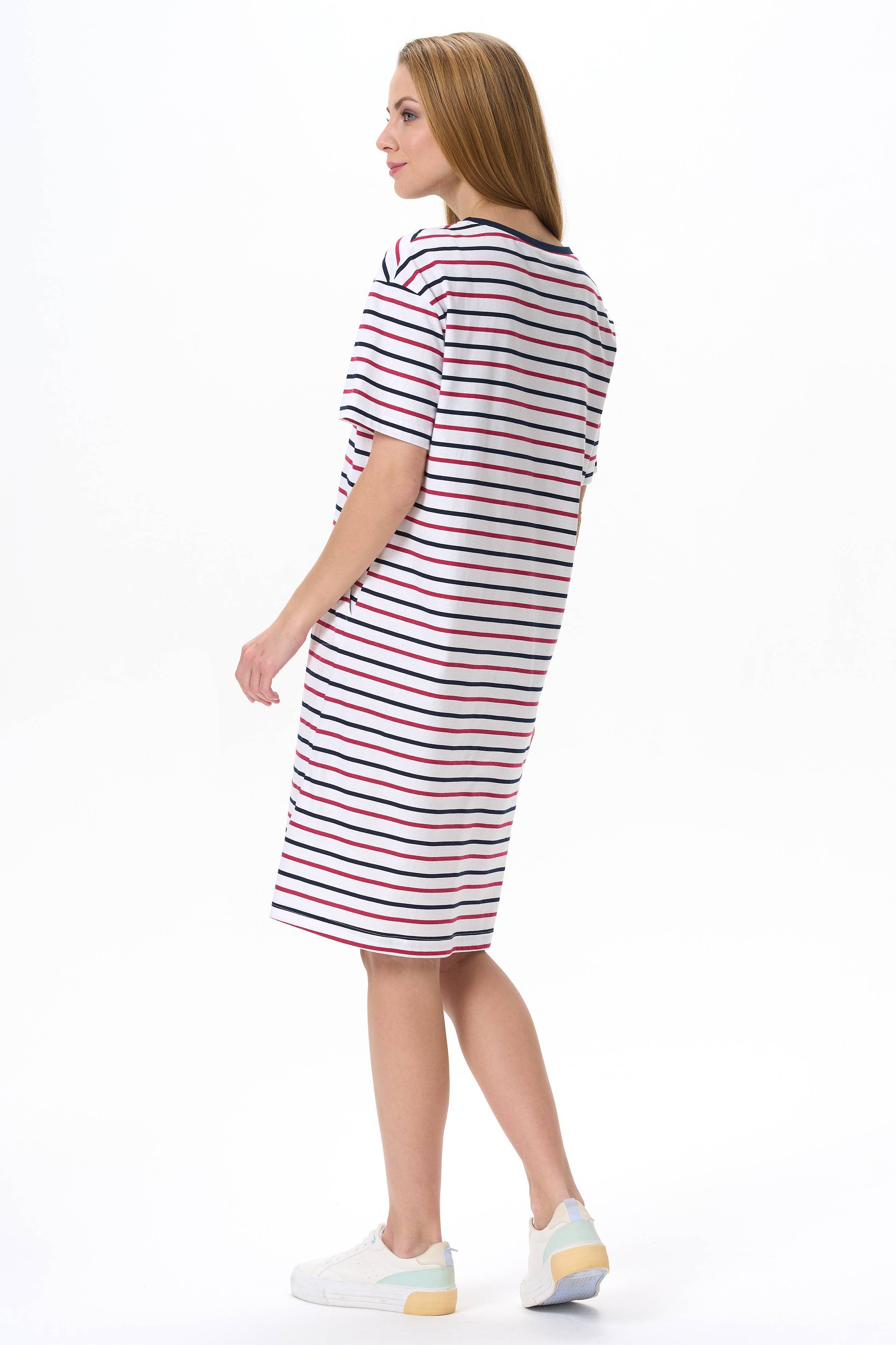 Комфортное платье прямого силуэта из хлопкового полотна. Круглый вырез горловины, обработан хлопковым полотном - рибана, спущенная линия плеча, длина рукава до логтя, в боковых швах карманы и по низу изделия шлицы. Длина платья ниже колена. Рост модели на фото 177.