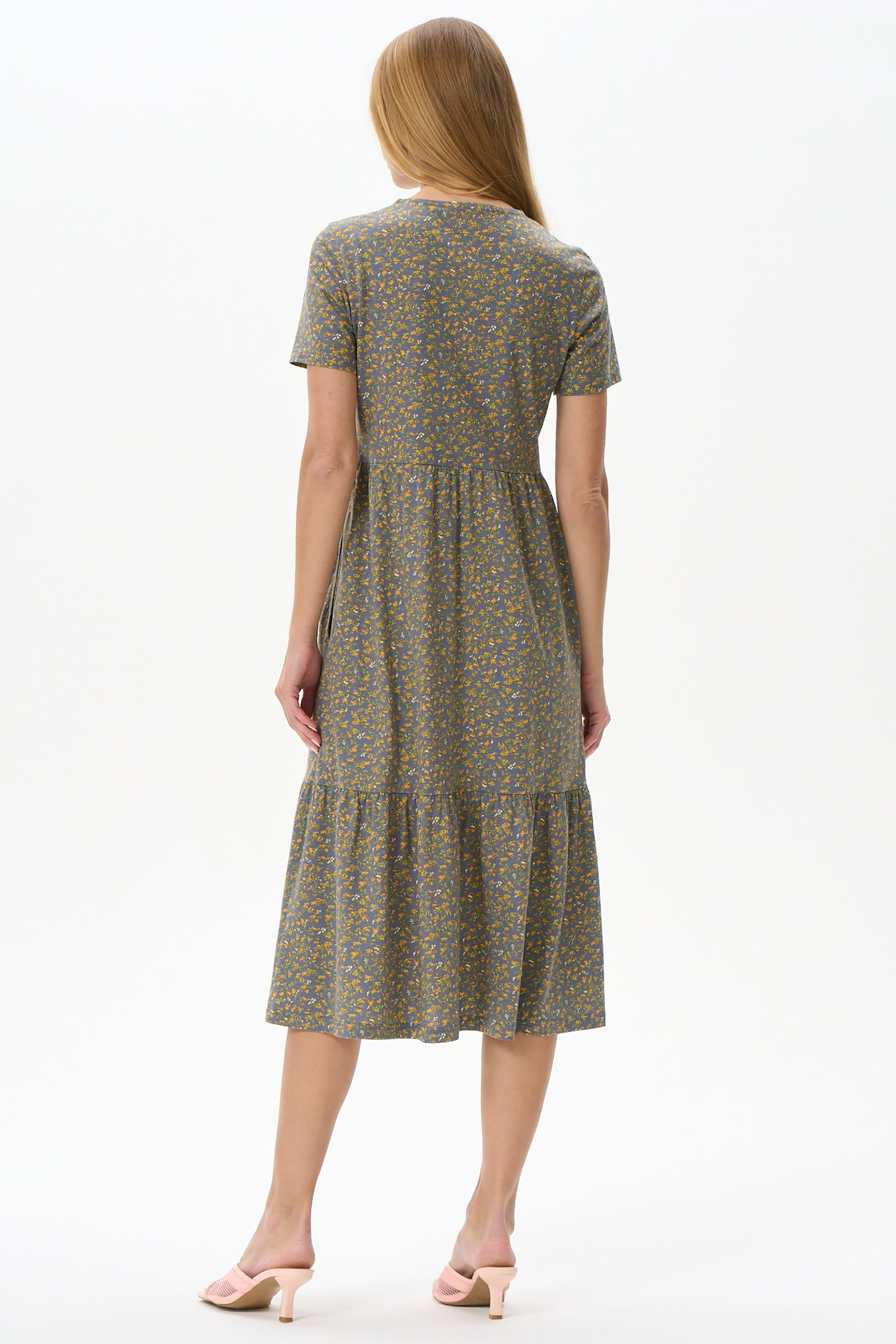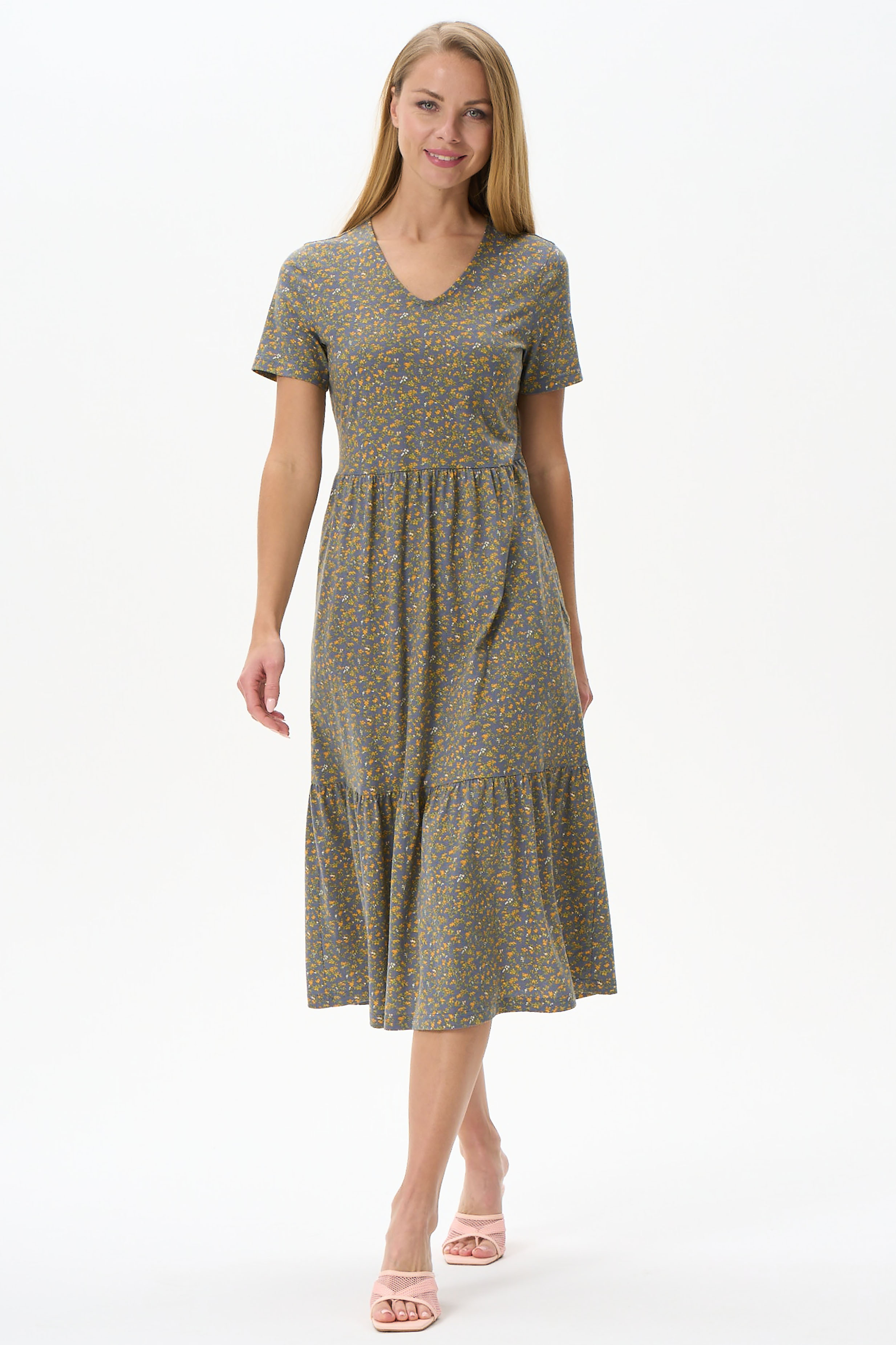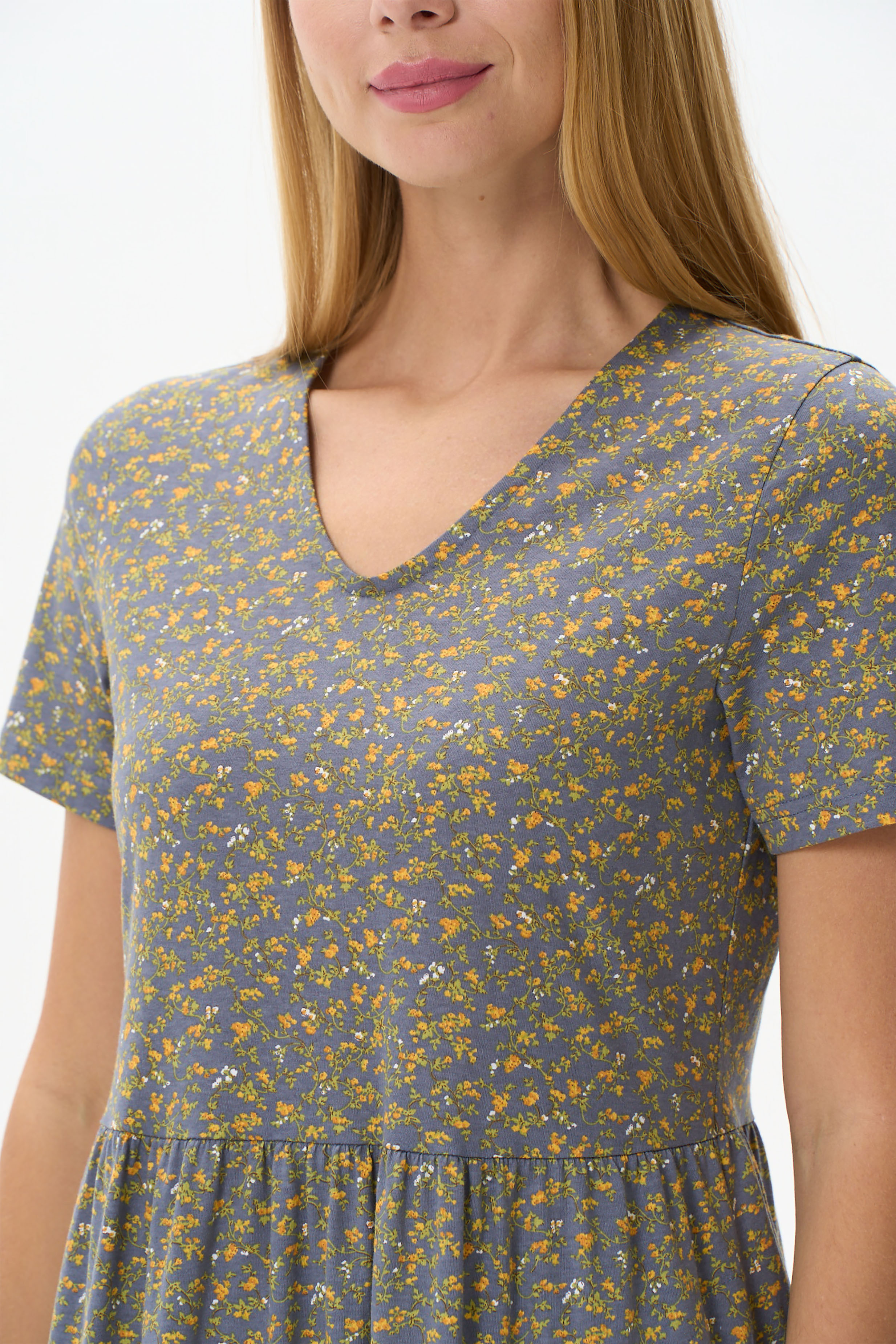 Платье расклешенного силуэта из хлопкового полотна. Вырез горловины V- образной формы. Короткий рукав, в боковых швах карманы. Длина изделия ниже колена. Рост модели на фото 175