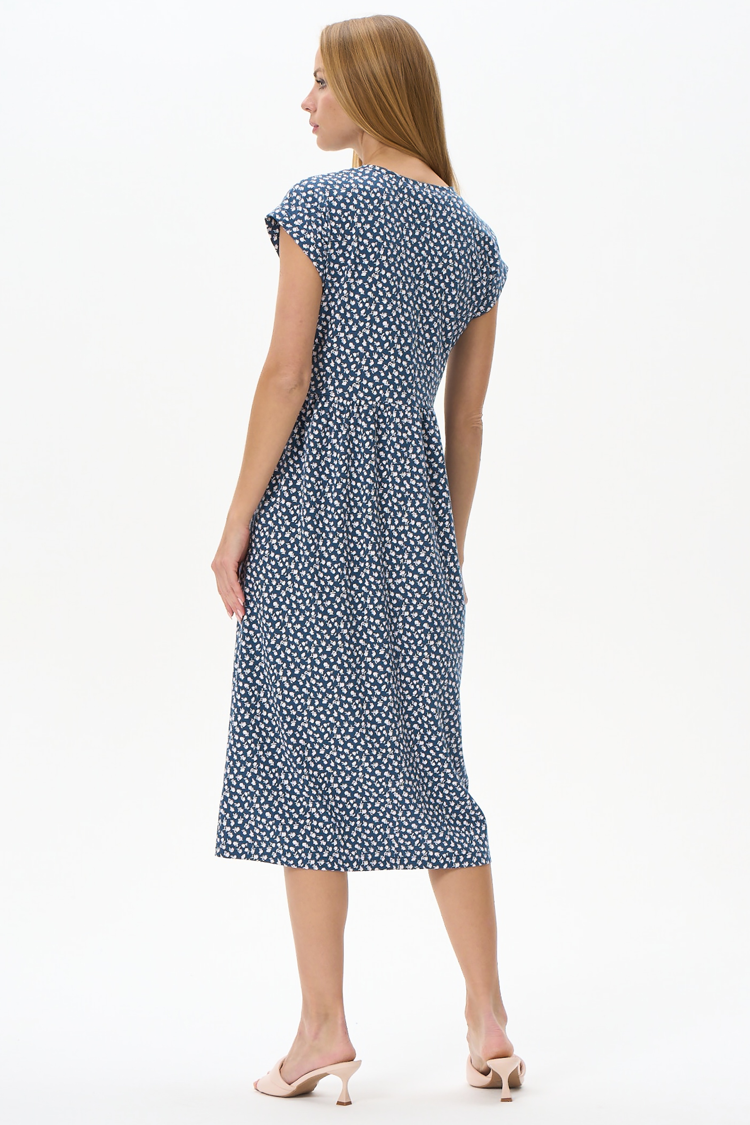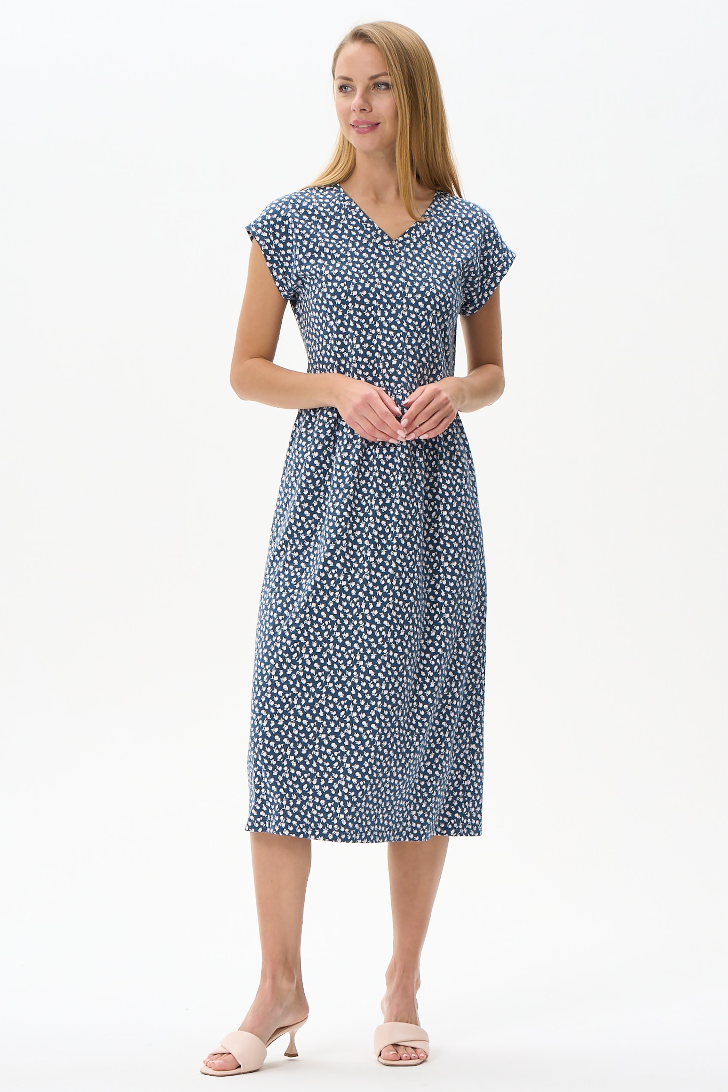 Платье из хлопкового трикотажного полотна. V-образный вырез горловины, цельнокроенные короткие рукава с притачными манжетами. В боковых швах карманы. Рост модели на фото 175см.
