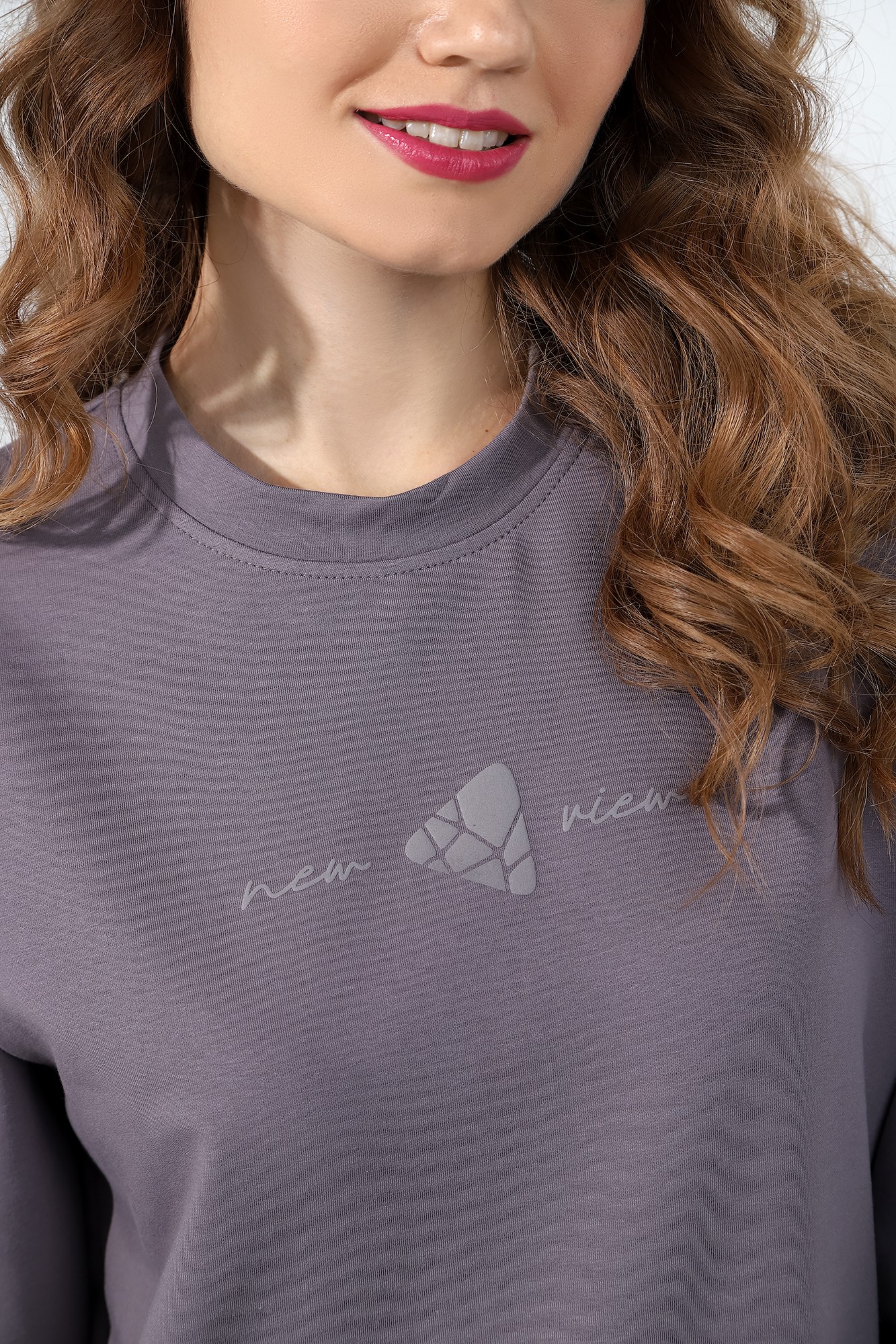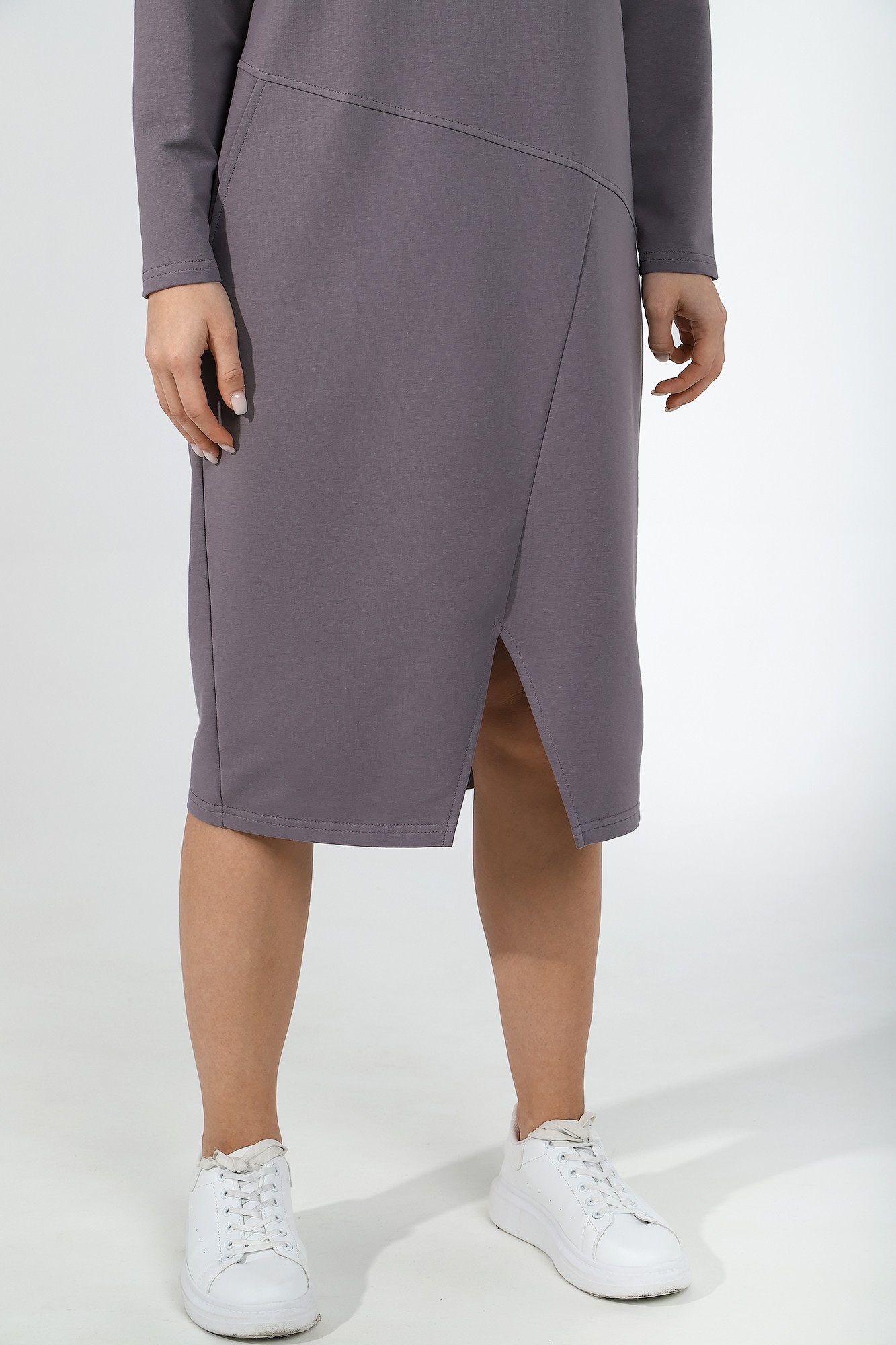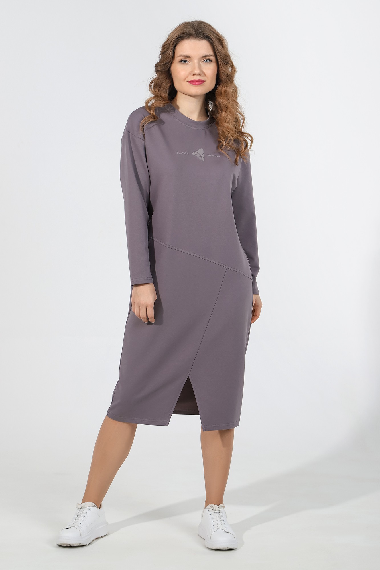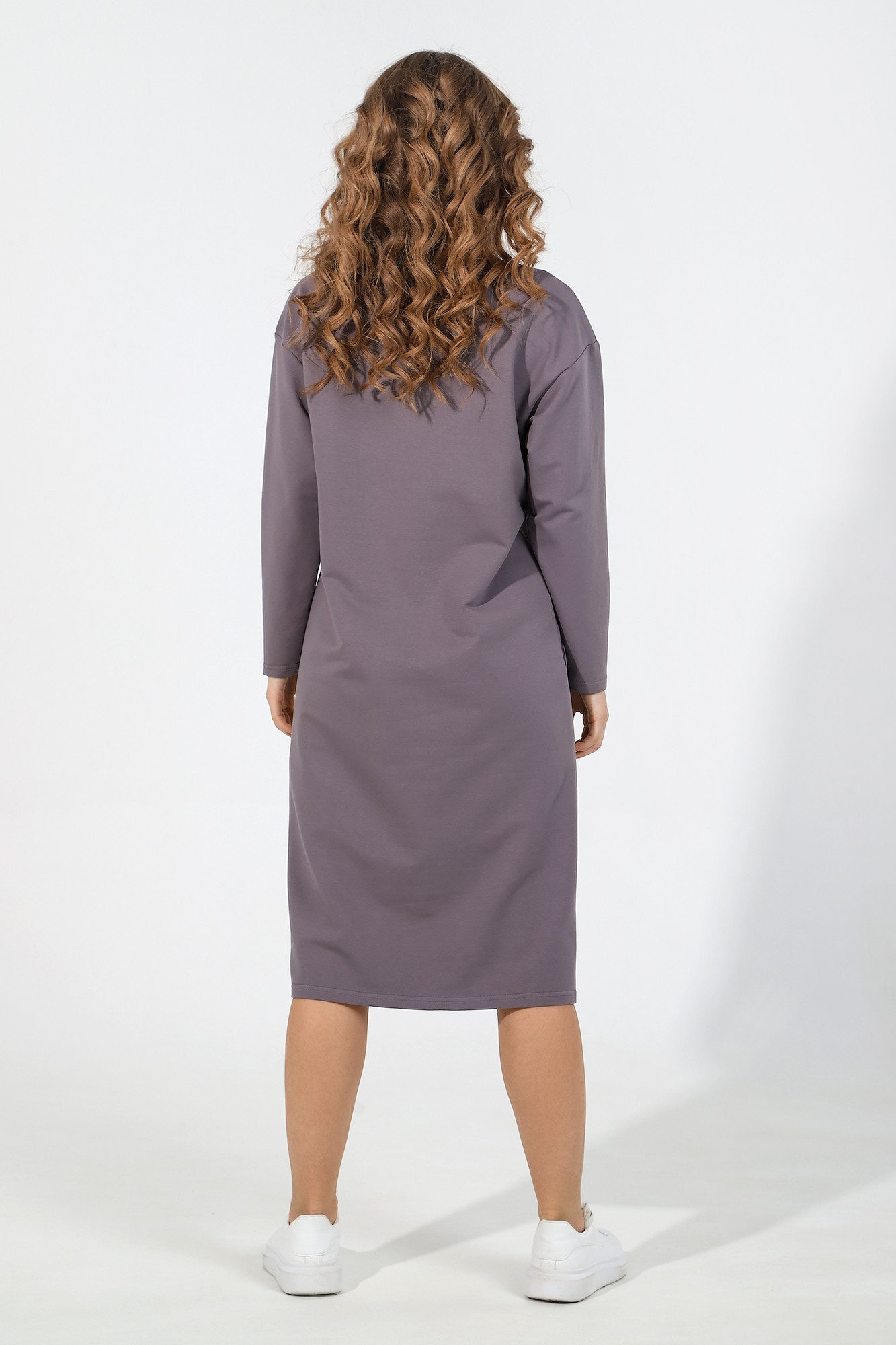 Платье молодежное из гладкокрашеного трикотажного полотна «футер-двунитка», удлиненное, прямого силуэта, с длинными втачными рукавами, горловиной овальной формы, обработанной втачной планкой, и принтом на полочке, выполненным в технике шелкографии. Перед – их трех частей, с одним карманом в правом боковом шве и разрезом V-образной формы в шве соединения двух нижних деталей между собой.