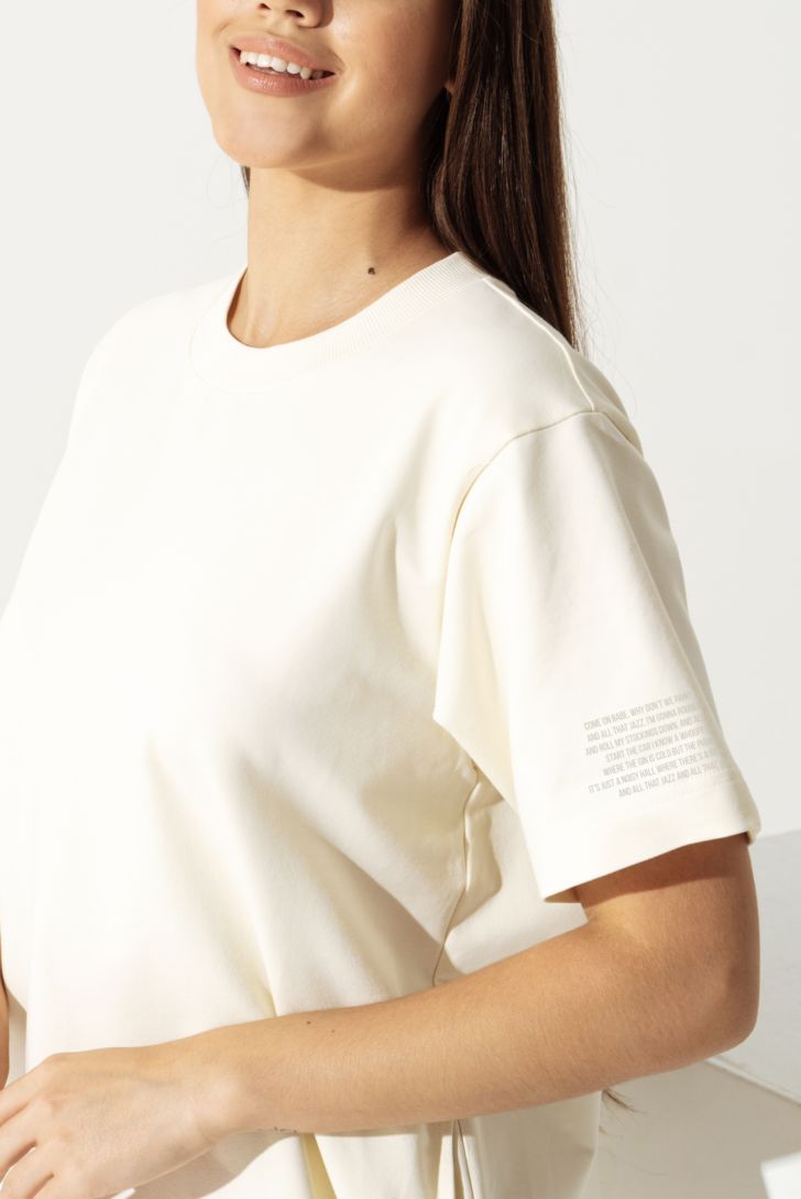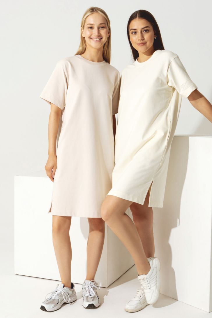 Платье - футболка свободного силуэта со спущенной линией плеча. Вырез горловины круглый, обработан кашкорсе. По боковым швам карманы в районе талии и разрезы внизу. Выполнено из гладкого и прочного хлопка премиального качества. Ткань гипоаллергенна, гигроскопична и очень тактильна.