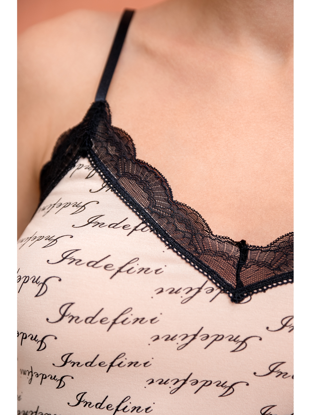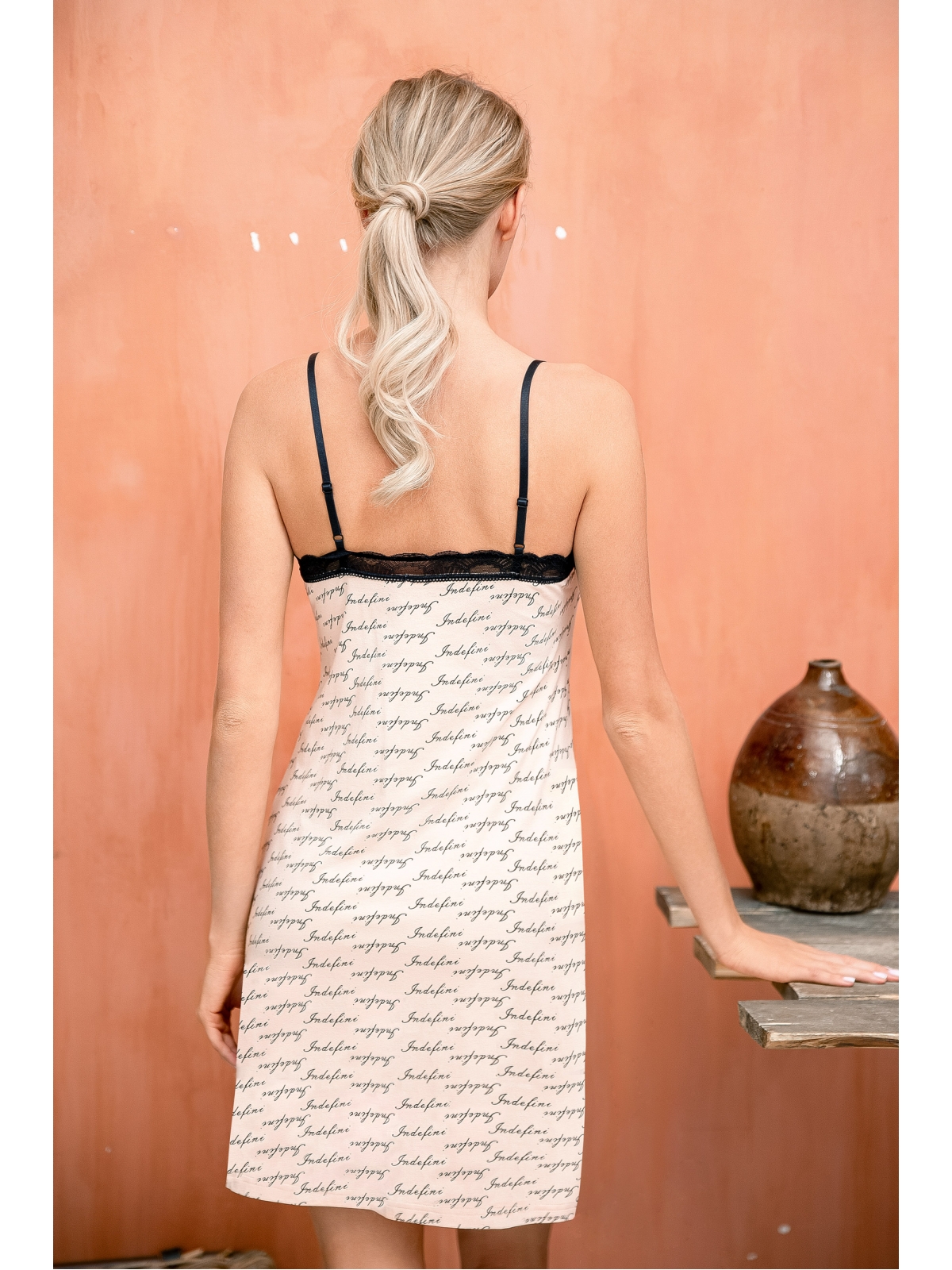 Домашняя женская сорочка из бамбуко-хлопкового материала гипоаллергенная. Свободный крой не сковывает движения и дает почувствовать свободу во время носки сорочки, предотвращая чувство стеснения. Благодаря тонким бретелям изделие можно регулировать под индивидуальные предпочтения. Верхний вырез обрамлён кружевными узорами. Данная модель украшена принтом-надписью.