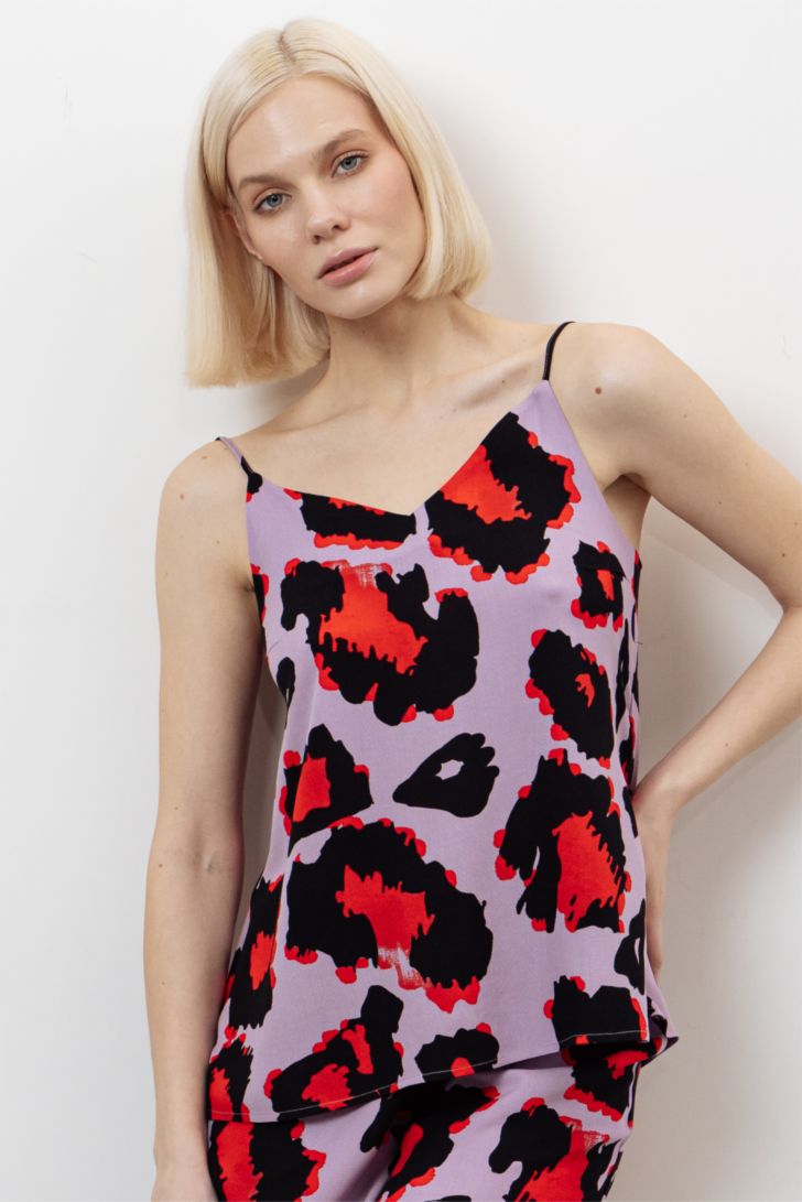 Топ на тонких регулируемых бретелях идеально подчеркивает фигуру и создает ощущение легкости и свободы. Вырез топа V-образный, глубокий.