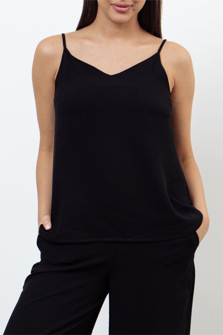 Топ на тонких регулируемых бретелях идеально подчеркивает фигуру и создает ощущение легкости и свободы. Вырез топа V-образный, глубокий.