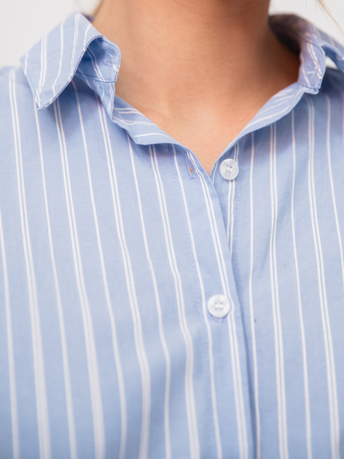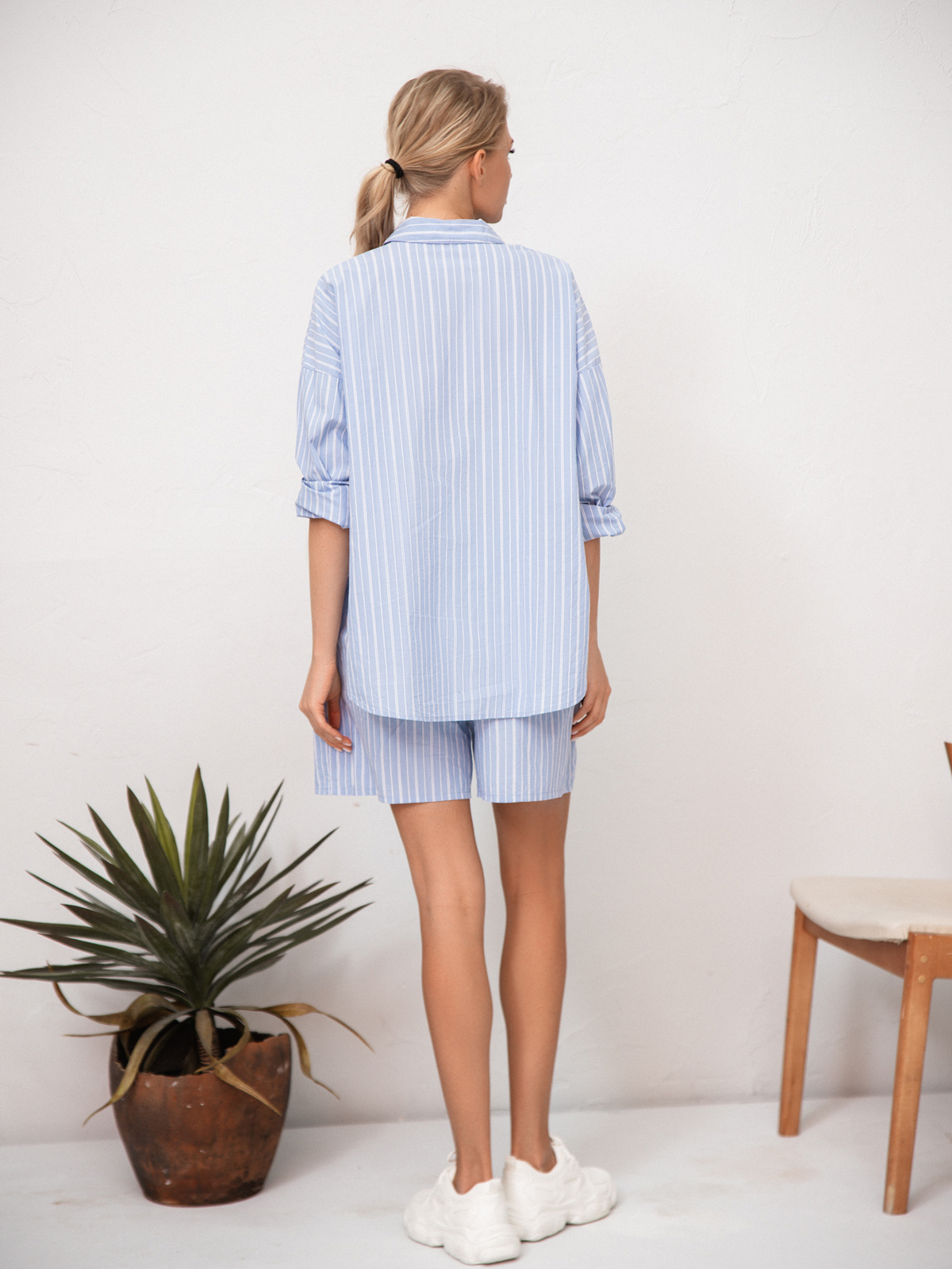Женская пижама из хлопковой ткани приятная на ощупь, хорошо впитывает влагу и пропускает воздух к телу, обеспечивая комфортный сон. Пижама включает в себя рубашку на пуговицах спереди и на манжетах, с длинным рукавом и отложным воротником. Рубашка прямого кроя, не сковывает и не стесняет движений. В комплект также идут шорты в полоску на мягкой широкой резинке с декоративной этикеткой спереди.
