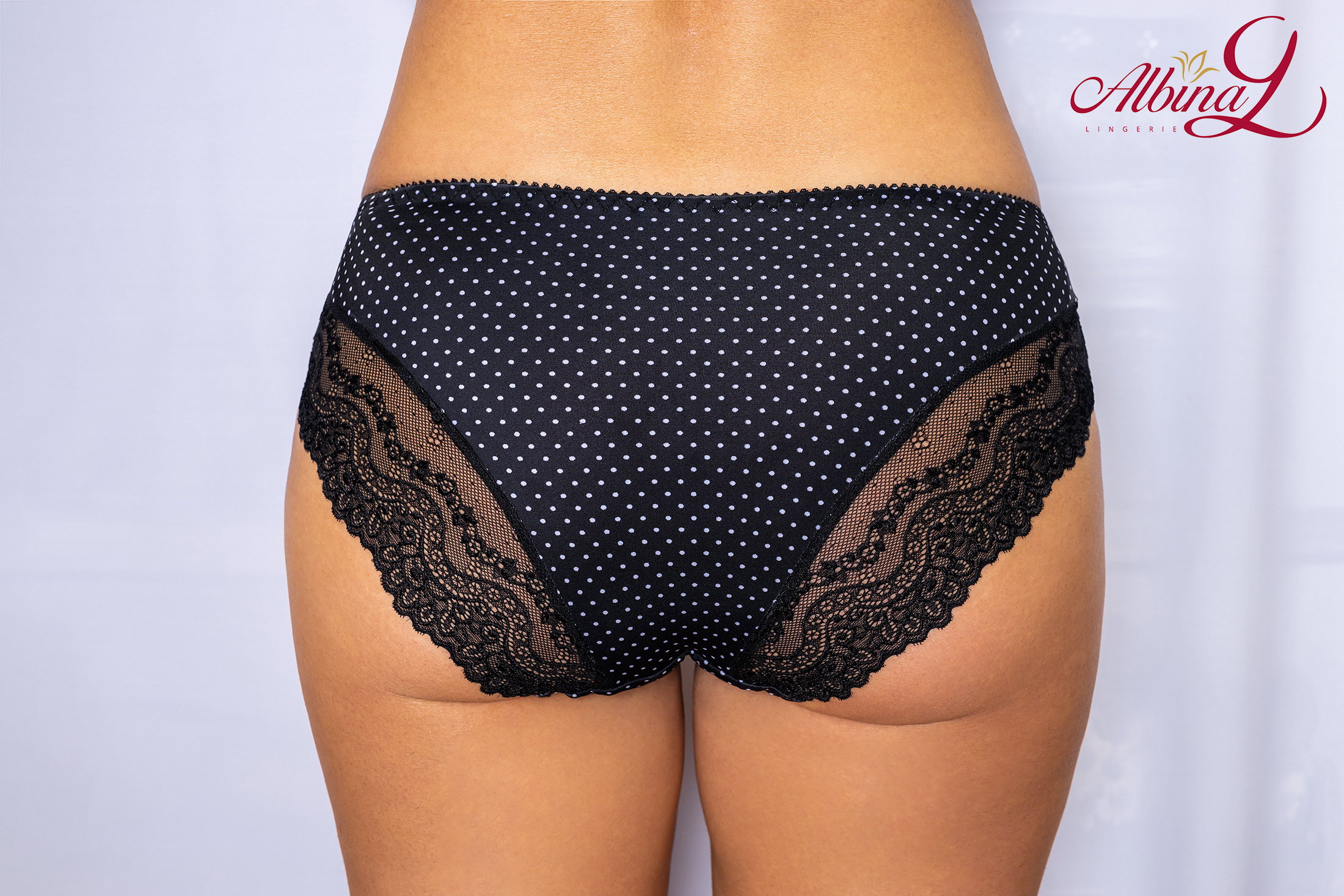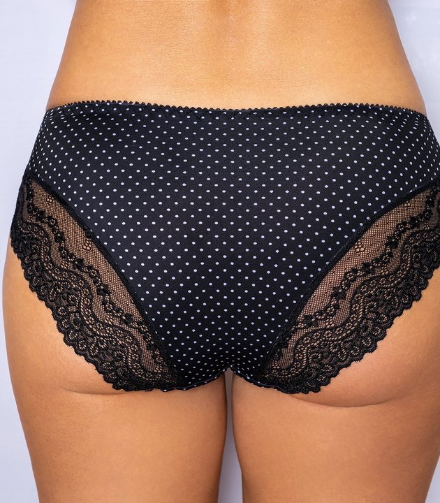 Трусы-слип со средней линией талии. Выполнены из набивной микрофибры в точку, гладкой микрофибры и эластичного кружева. Украшение: атласный бантик.