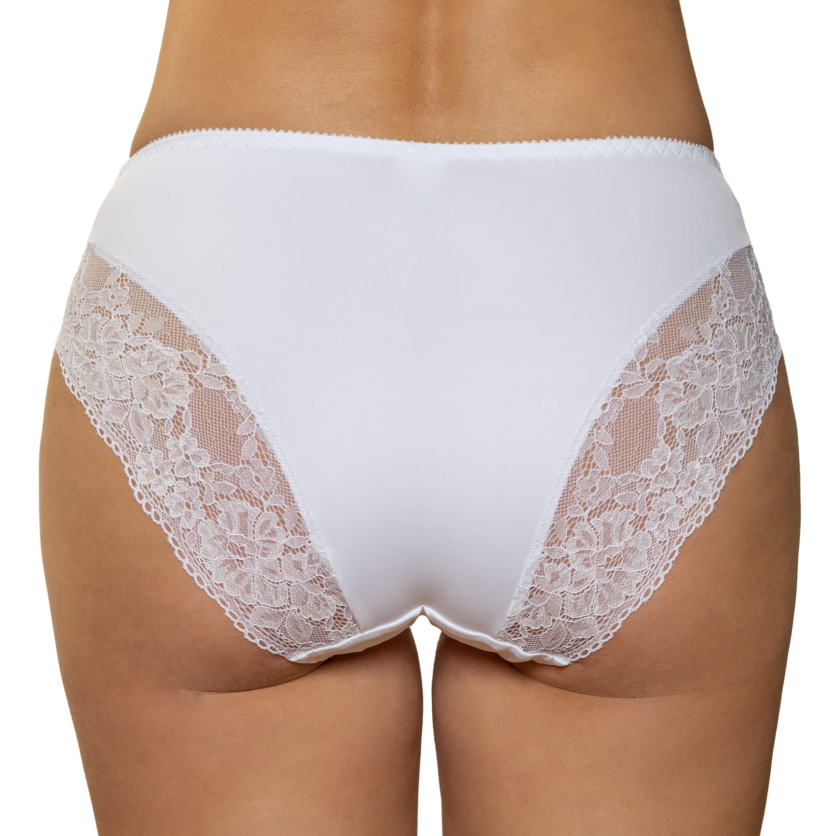 Трусы-слип комфорт с завышенной линией талии. Выполнены из эластичного принтованного полотна и эластичного кружева. Срезы по краю ножек обработаны на плоскошовной машине. Украшение: атласный бантик.
