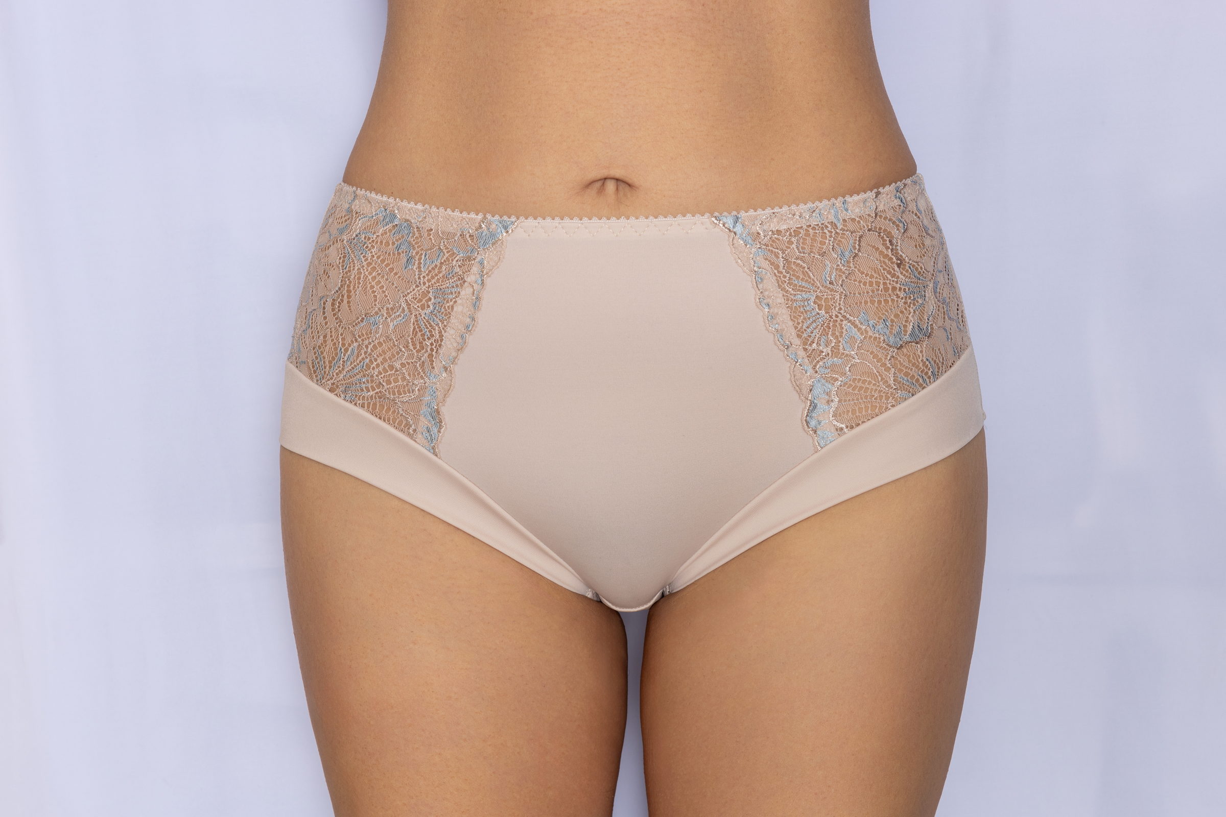 Трусы-слип комфорт с высокой линией талии макси. Выполнены из вышивки на неэластичной сетке, микрофибры. Передние нижние детали выполнены "всгиб", что позволяет дамам с формами чувствовать комфорт при носке.