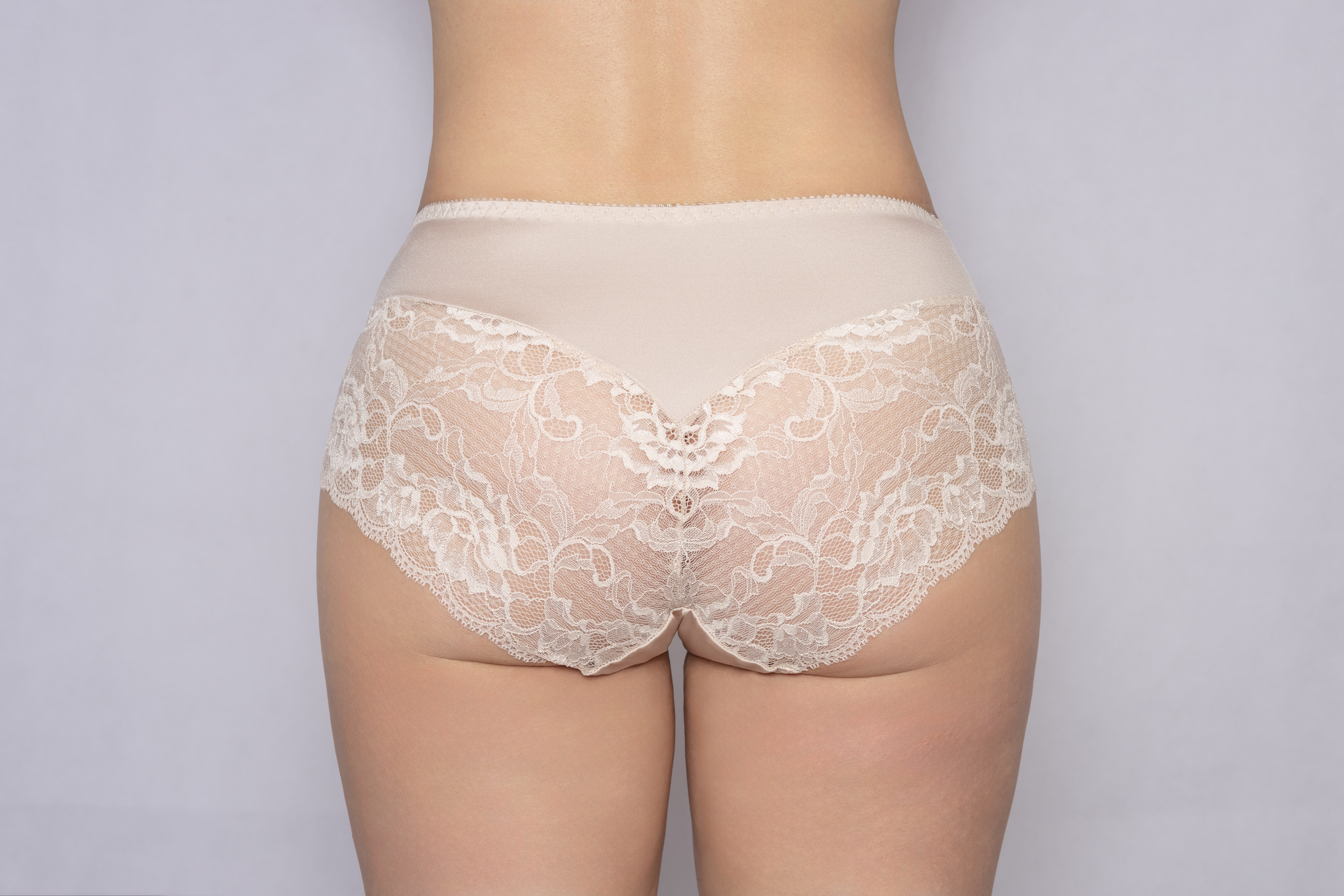 Трусы-слип комфорт с завышенной линией талии. Выполнены из эластичного принтованного полотна и эластичного кружева. Срезы по краю ножек обработаны на плоскошовной машине. Украшение: атласный бантик.