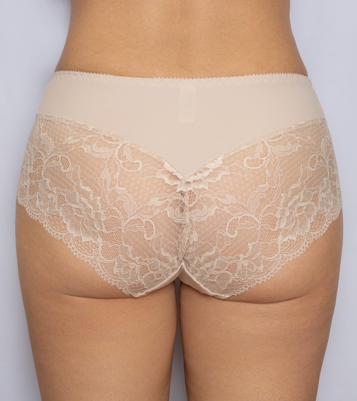 Трусы-слип комфорт макси с завышенной линией талии. Выполнены из набивного фактурного полотна с цветочным орнаметом, микрофибры, эластичного кружева и сетки. Срезы по краю ножек обработаны на плоскошовной машине.