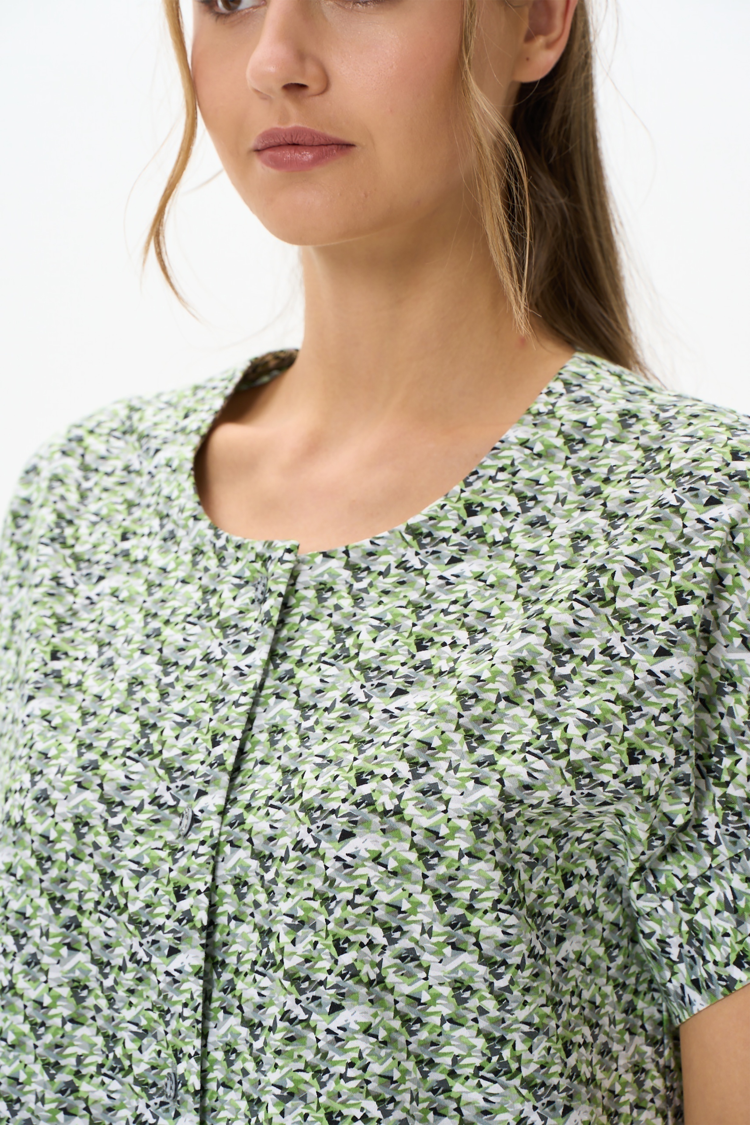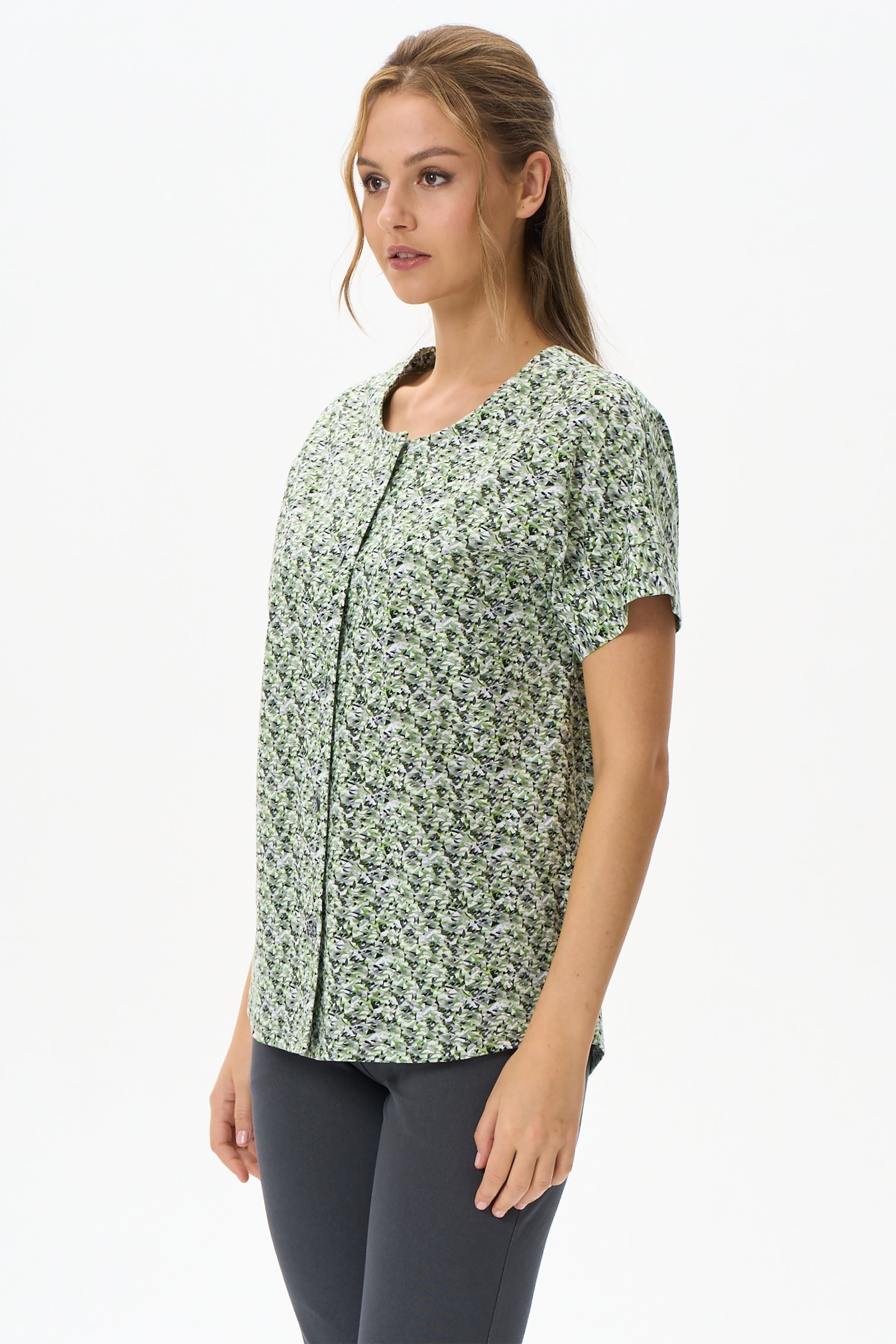 Блузка свободного силуэта из хлопкового трикотажного полотна. Застёжка на пуговицы, круглый вырез горловины, цельнокроеные рукава с притачными манжетами. Рост модели на фото 177см.