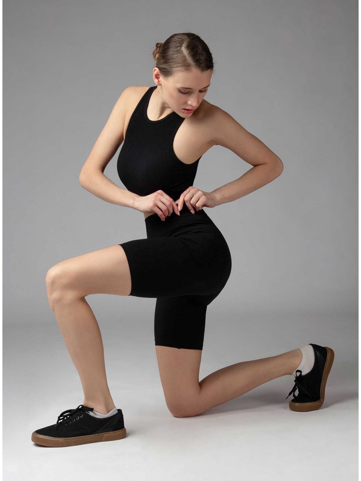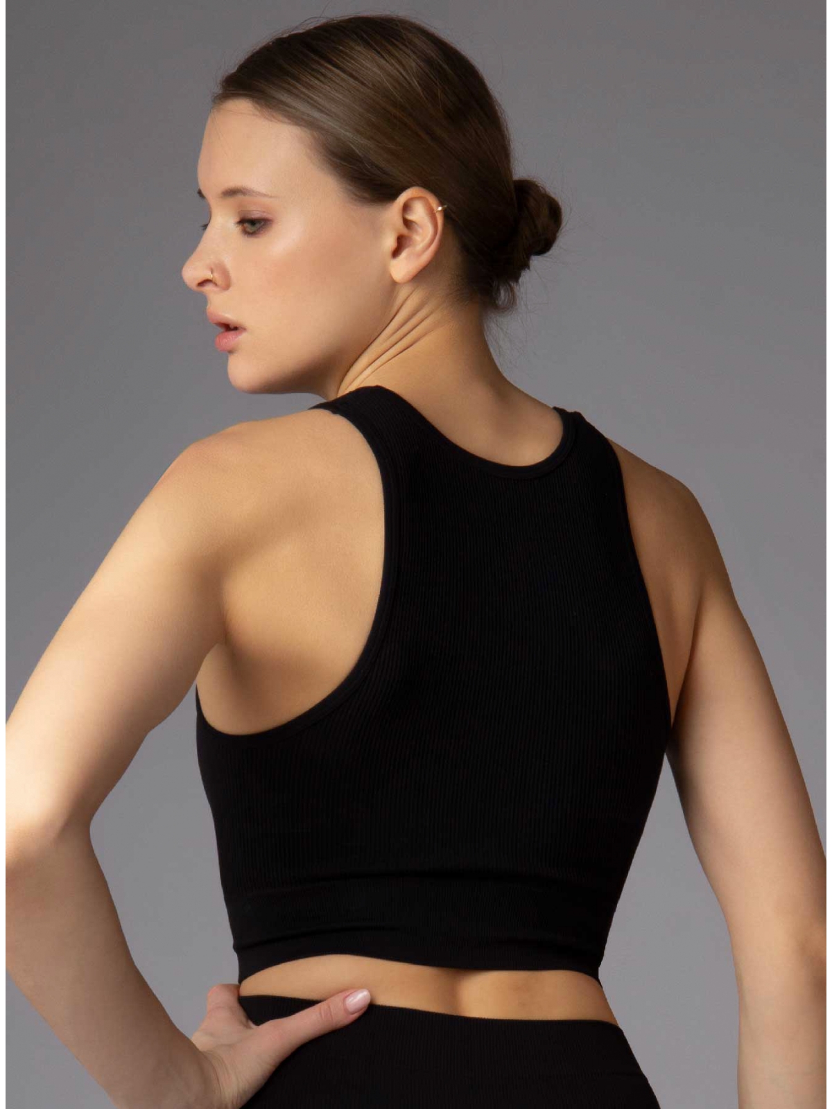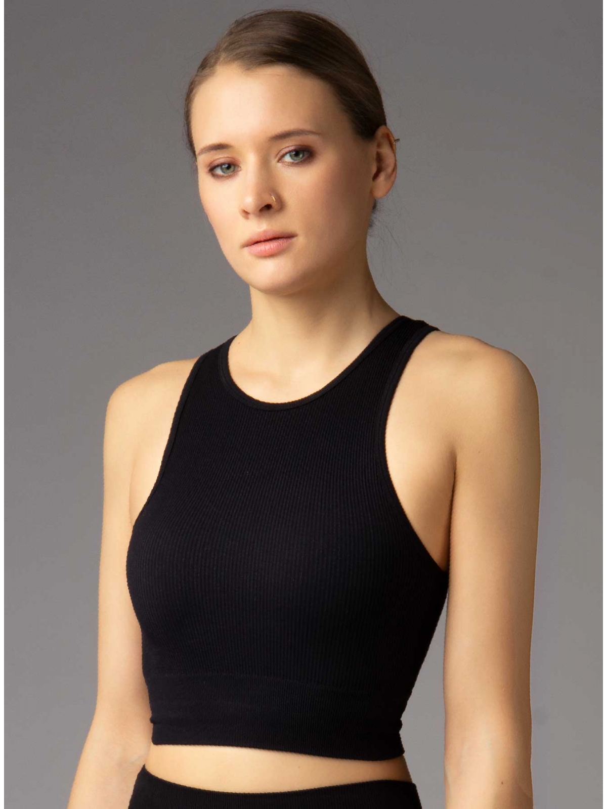 Женская майка-топ от торговой марки Индефини. Майка-топ из полиамида, черного цвета, в рубчик, на резинке, укороченная.