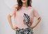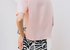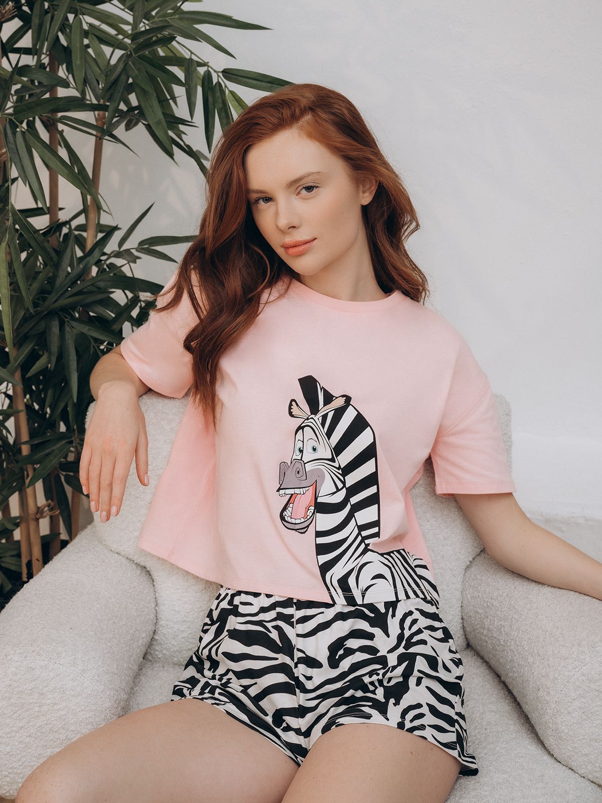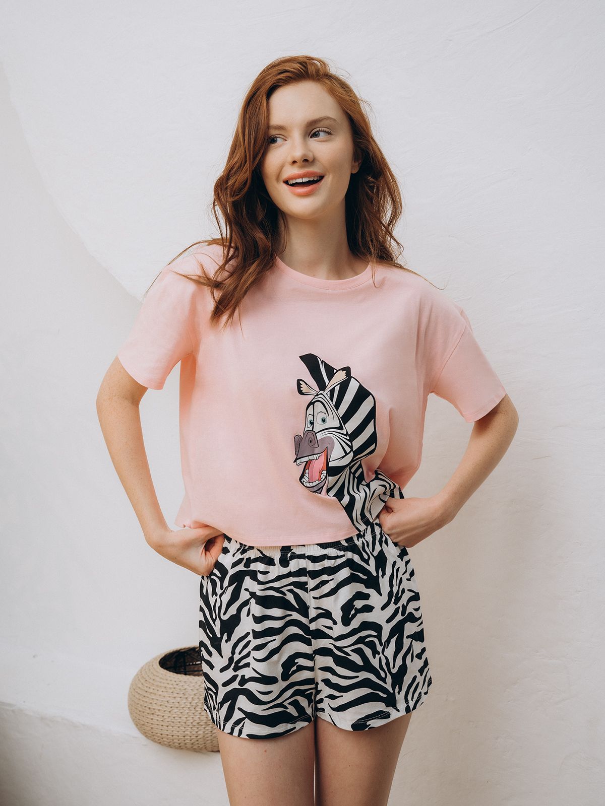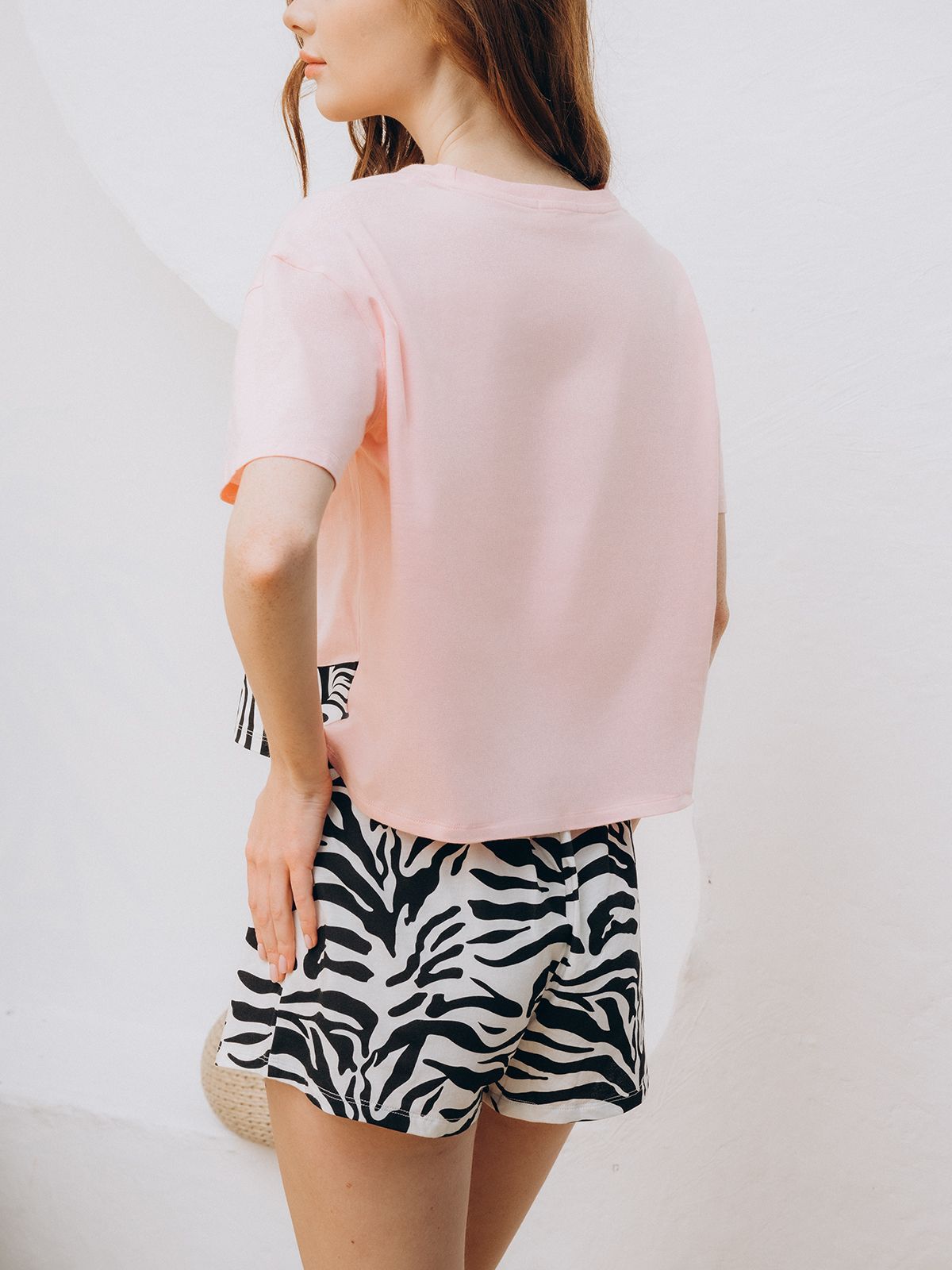 Пижама женская, изготовленная из хлопкового трикотажа, состоит из футболки и шорт. Футболка розового цвета имеет короткие рукава и округлый верхний вырез. Черно-белые шорты с тонкой эластичной резинкой на талии. Пижама украшена анималистичным принтом.
